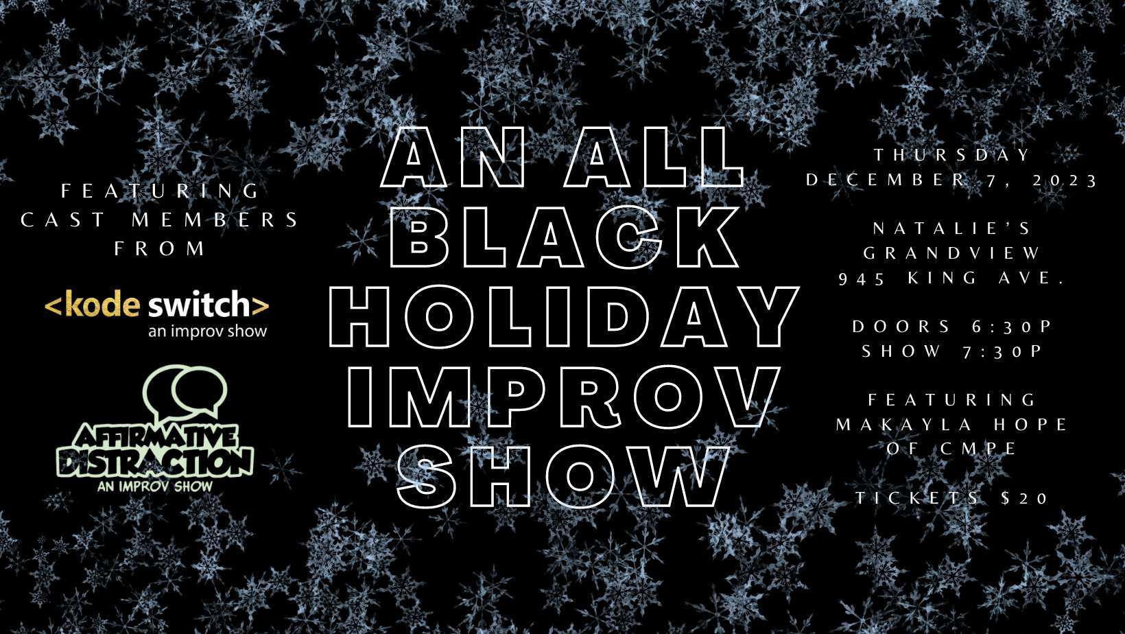 Join us as we team up with Natalie's Grandview, and give you an all made up holiday show. Members of both Affirmative Distraction, and Kodeswitch will come together to spread some of that holiday cheer. We promise it'll be better than those plates you're showing on Social media. Everything you'll see will be made up on the spot…