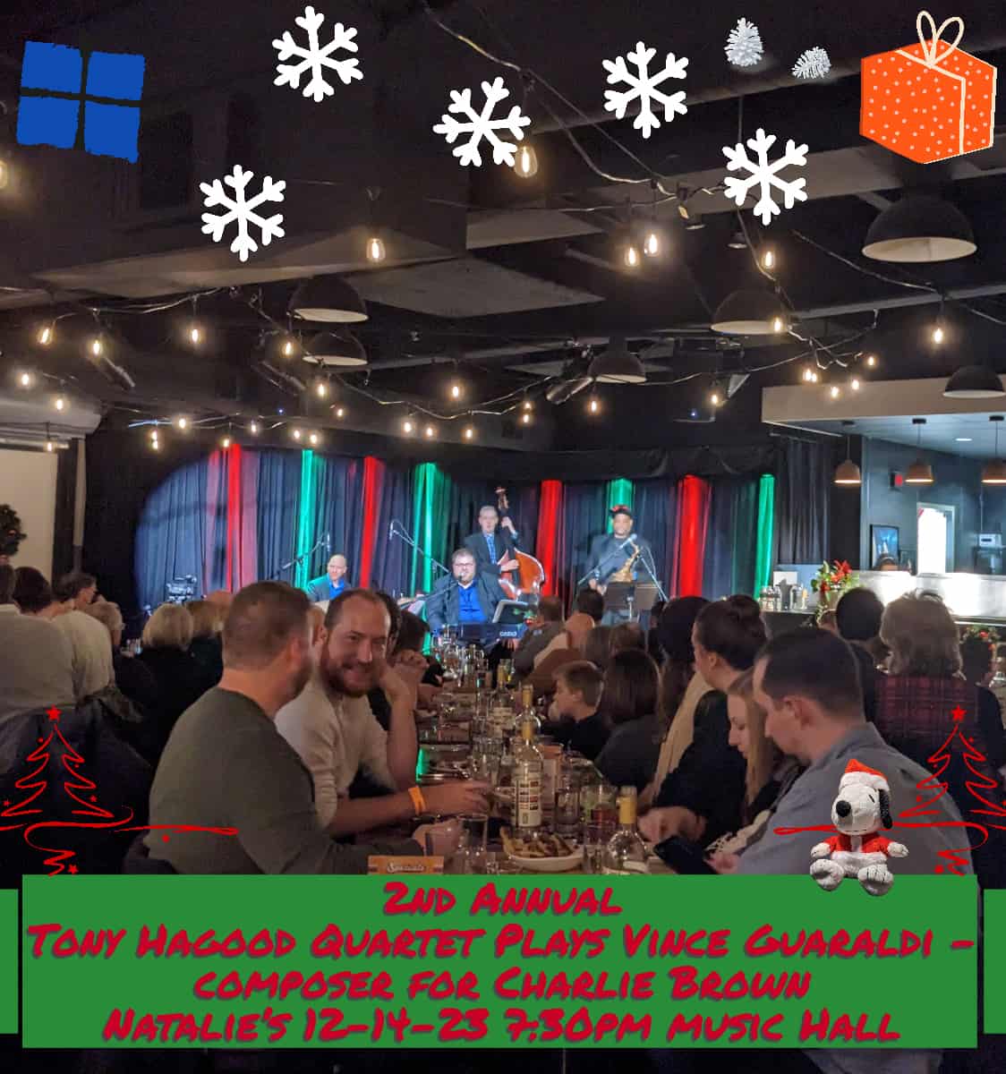 For the Second Year in a Row, The Tony Hagood Quartet performs the music of Vince Guaraldi, the composer of music for Charlie Brown/Peanuts. Just in time for the holidays, enjoy arrangements of favorites like Linus and Lucy, Christmas Time is Here, O Christmas Tree, Cast Your Fate to the Wind and many many more!…