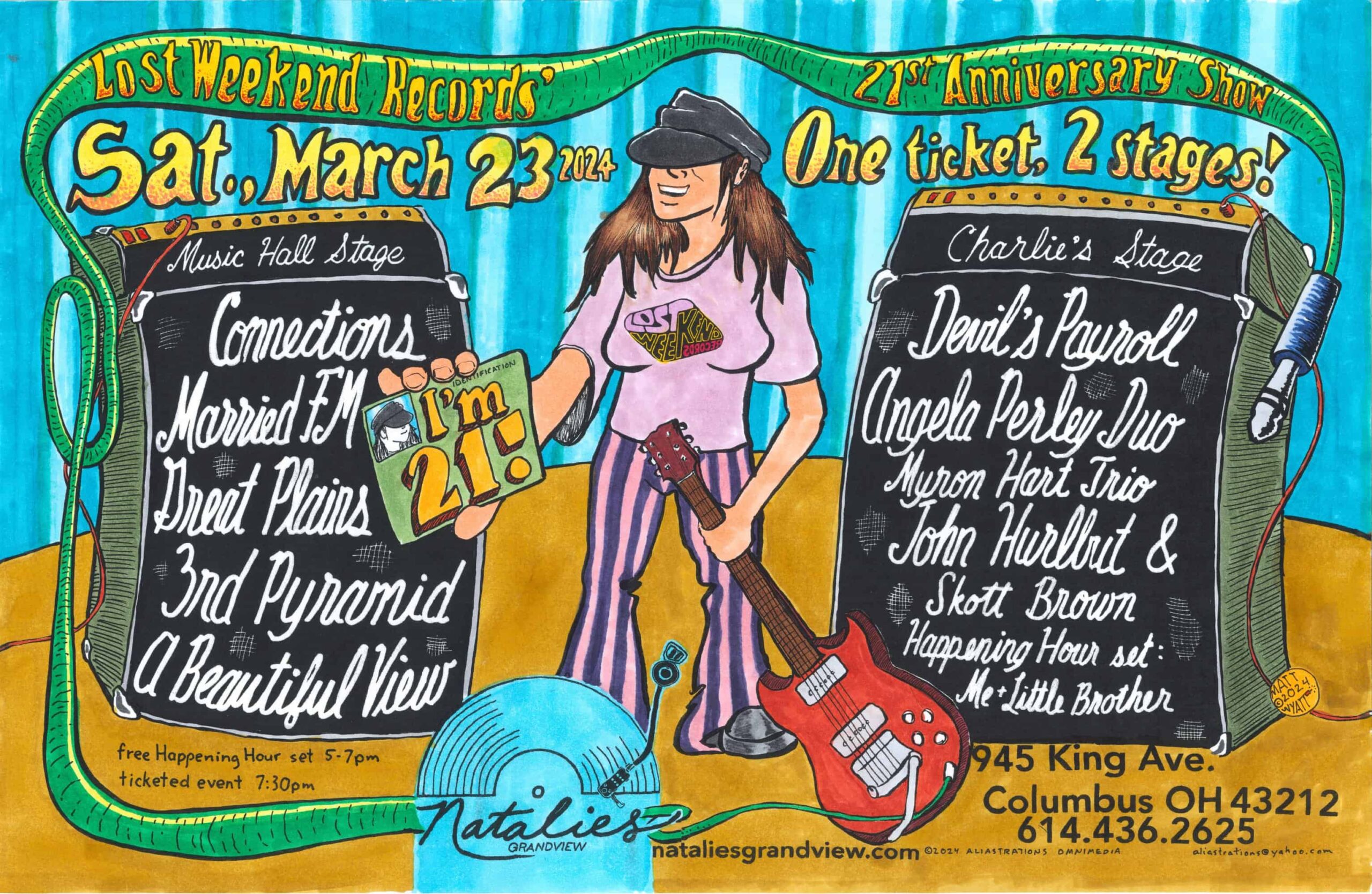 Natalie's is thrilled to celebrate 21 Years of Lost Weekend Records! One ticket gives you access to a full night of music on two stages featuring (all times approximate): Music Hall Stage: Connections - 11:30pm Married FM (debut show)- 10:30pm Great Plains (reunion)- 9:30pm 3rd Pyramid - 8:30pm A Beautiful View - 7:30pm Charlie’s Stage:…