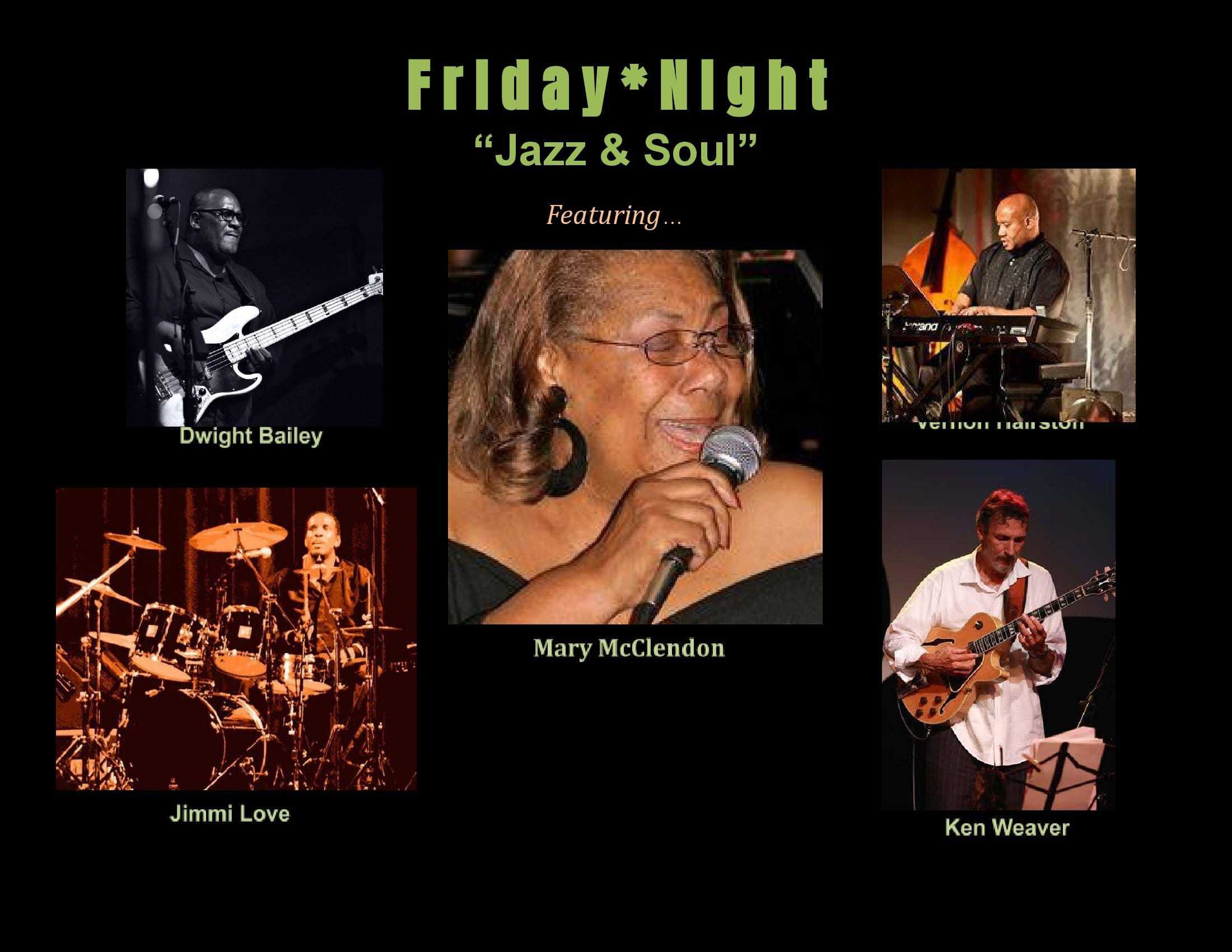 Join us for a Night of Jazz & Soul featuring vocal legend Mary McClendon, backed by Vernon Hairston on piano, Ken Weaver on guitar, Jimmi Love on drums and Dwight Bailey on bass. Expect a night full of standards filled with soul from these top musicians! Food & Bar: Our full food and drink menu…